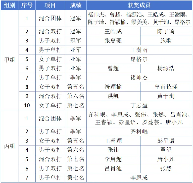 在本次赛事中,太阳成集团tyc7111cc共派出27名队员参赛,整体发挥出色,几乎全员都斩获成绩。球队在团体赛和单项赛中全面开花,共荣获三金三银三铜的优异成绩。其中,甲组代表队继去年夺得男团、女团冠军后,今年再度获得混合团体冠军;在单项赛事上,男双包揽冠亚军,混双项目成功卫冕,男单获得第二、第三名,女单摘得第二名,并取得多个单项优秀名次。丙组代表队同样表现亮眼,斩获混合团体第三名、男单第三名及多个单项优胜奖项,实现了新的突破。